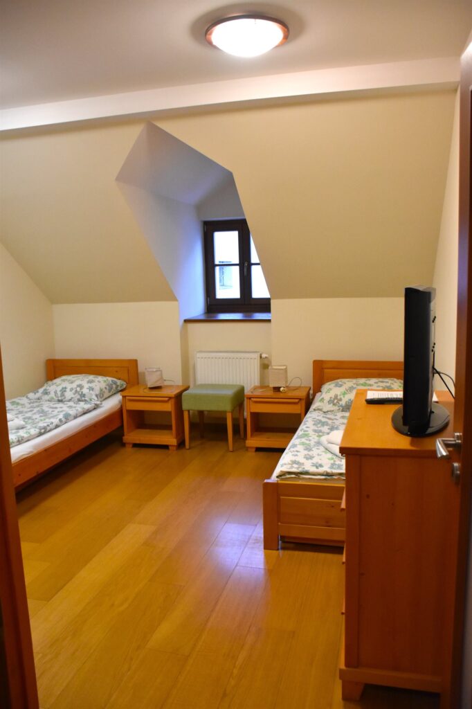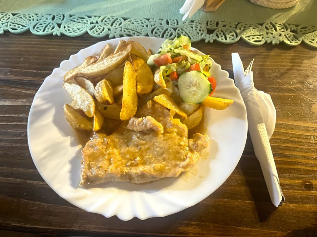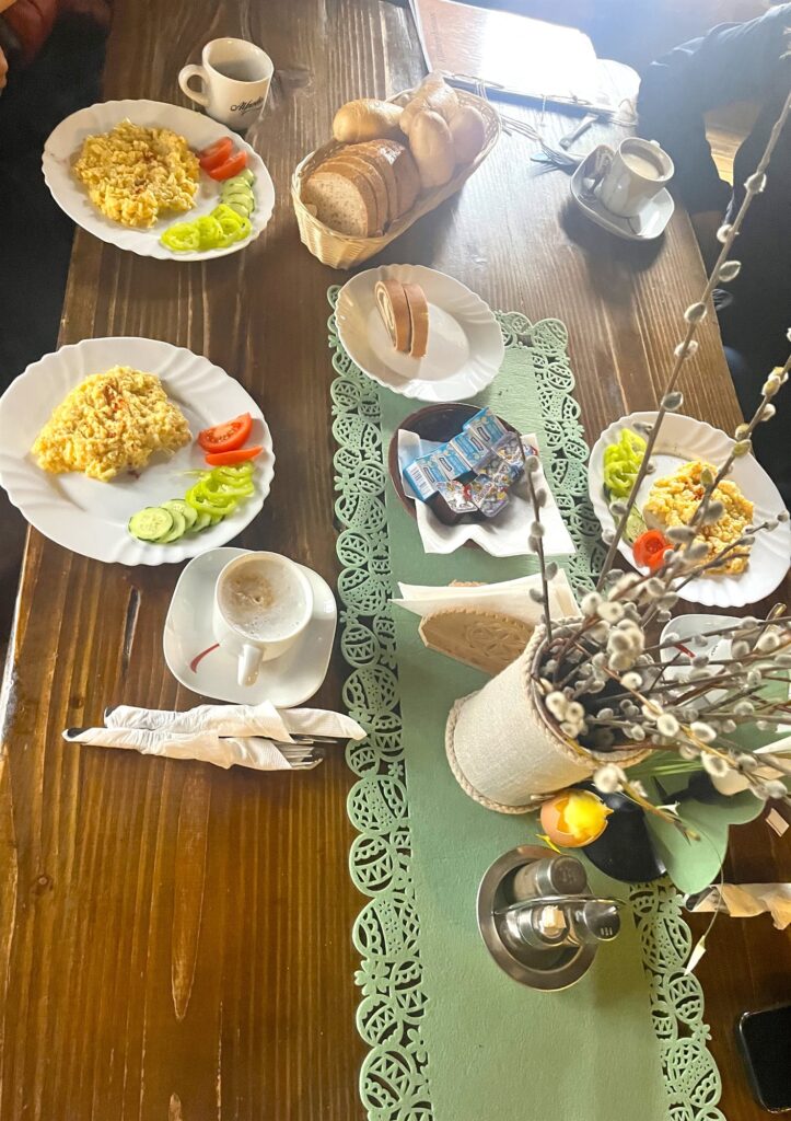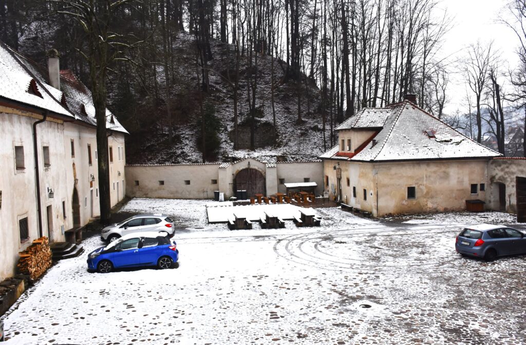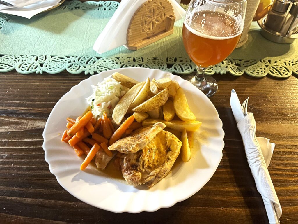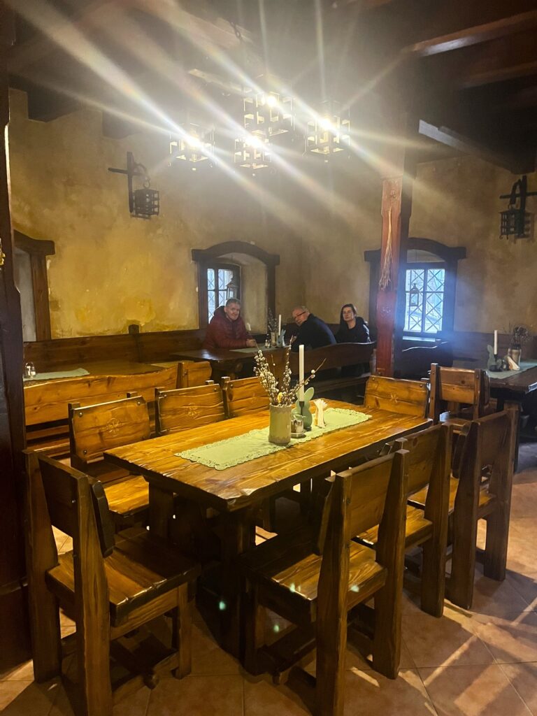 Stravovanie sme mali zabezpečené v dobovej Krčme pod lipami, ktorá bola priamo v areáli kláštora. Veľmi sa nám páčil historický ráz tejto krčmy, ktorý úplne zapadal do konceptu kláštora. Atmosféra tam bola čarovná, človek sa takto môže vrátiť v čase. Modernú reštauráciu by som si na tomto mieste ani nevedela predstaviť. Nevýhodou tejto krčmy bolo, že sa zatvárala o 17,00 hod. Preto sme si dávali skorú večeru niečo po štvrtej hodine poobede. Raňajky a v podstate i večeru sme si objednávali deň vopred z jedálneho lístka. Pri raňajkách bol k dispozícii automat na kávu, ale hoci sme si mohli vybrať z rôznych druhov, išlo skôr o „raňajkovú kávu“, než o plnohodnotné espresso. V ponuke bol aj čaj, ale chýbal mi nejaký džús, ktorý by bol súčasťou raňajkového menu. Večere boli tiež v takom „domáckom štýle“. Maďarský guľáš, či bravčový vyprážaný rezeň, kapustnica, či cesnaková polievka. Chlapi však boli spokojní :-). Ochutnali sme tiež miestne medové pivo Romauld 15 %. Veľmi mi chutilo. V krčme je samoobsluha, ale zrejme nám bolo uznané privilégium obsluhy až k stolu. Personál bol milý a ústretový. Ako v správnej dobovej historickej krčme tam toalety nehľadajte 🙂 . Toaleta sa nachádza vo vonkajšom priestore na opačnej strane nádvoria. Keďže sme však boli na nádvorí ubytovaní, tak sme ju nevyužili.