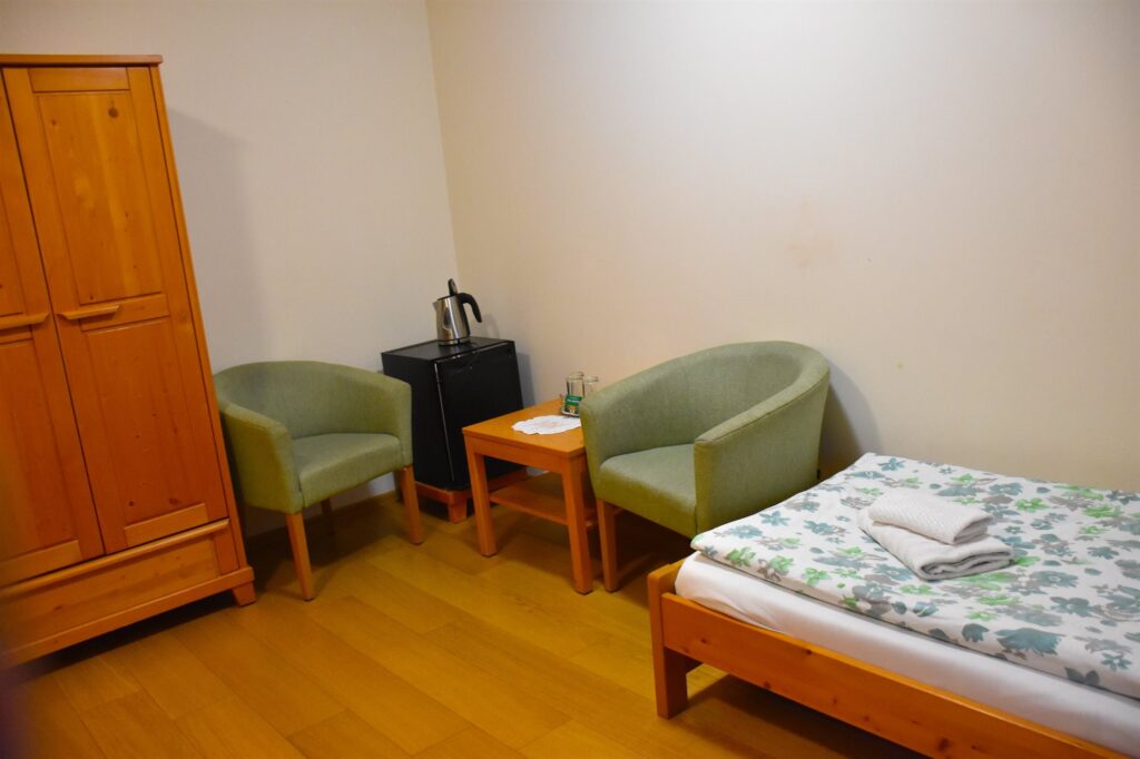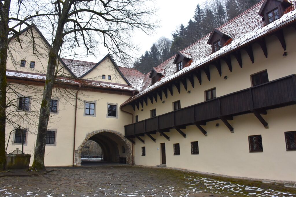 Ubytovaní sme boli priamo v Múzeu Červený Kláštor, spravované organizáciou Cyprian, n.o.. Pobyt sme zakúpili na Booking.com. Cena za ubytovanie na 2 noci s raňajkami pre 2 osoby bola 140 €, avšak do faktúry sme si dali zapísať aj večere. Pobyt s polpenziou nás tak vyšiel na 189 € pre 2 osoby. Kláštor má ubytovanie v izbách na hlavnom nádvorí alebo vo vnútrobloku, bývalé izby mníchov. Samozrejme zrekonštruované, s prispôsobením sa dnešnej dobe. Je pochopiteľné, že nemôžete čakať hotel typu all inclusive. Ide skôr o ubytovanie penziónového typu. Mňa zaujalo práve to, že sme aspoň na chvíľu mohli byť takto spojení s históriou Červeného Kláštora. Izby boli jednoducho zariadené, oddelené postele, skriňa, nočné stolíky, malý stôl a kreslá. Súčasťou izby bol televízor, minichladnička a rýchlovarná kanvica. Výhľad z okna smeroval na nádvorie. Kúpeľňa bola prepojená s toaletou a vybavená sprchovacím kútom. Samozrejmosťou boli osušky, uteráky, sprchovací gél, tekuté mydlo a milo prekvapil aj fén na vlasy.